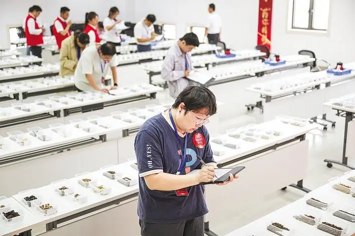 5月中旬,第二届“药王杯”中药产业技能大赛在国药集团中联药业有限公司举行。图为中药师同台竞技,正在辨别中药性状及真伪。 (湖北日报全媒记者 任勇 通讯员 王敏 摄)