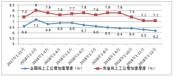 增加值增速快于全国。2018年,全省工业增加值累计增速为7.1%,快于全国0.9个百分点,但增幅同比回落0.3个百分点,环比持平。增加值当月增长5.5%,环比提升1.1个百分点,同比回落1个百分点。从工业增速趋势看,一、二、三、四季度增加值累计增速分别为7.8%、7.8%、7.8%、7.1%,工业经济运行总体平稳。