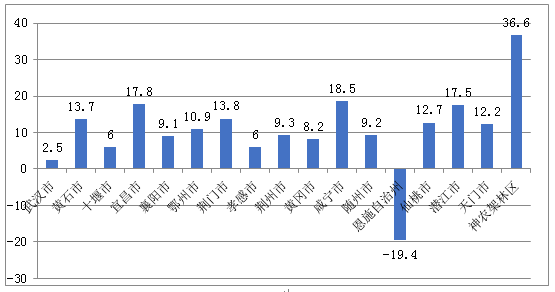 (二)部分行业地区分化明显。今年工业效益增长主要靠原材料拉动,建材、钢铁、化工、纺织、农副食品加工行业利润分别增长54.2%、47.9%、33.1%、29.5%、28.4%,以上五个行业对全省工业利润增长贡献率为51.8%。分行业看,41个大行业中有15个行业利润增幅低于10%,8个行业出现负增长。汽车行业受东风本田、神龙公司、武汉通用等整车企业产销下滑影响,全年利润仅增长0.1%,比2017年增幅低9.6个百分点。分市州看,17个市州中有14个利润实现增长,3个市州利润下降,林区同比减亏,武汉、咸宁分别下降1.9%、14.2%。