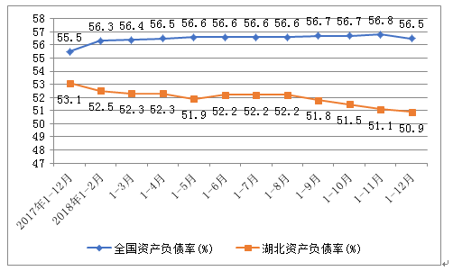 企业资产负债率持续下降。2018年,全省规模以上工业资产合计39895.1亿元,增长9.3%;负债合计20307.7亿元,增长4.7%;资产负债率50.9%,同比、环比分别下降2.2、0.2个百分点,低于全国5.6个百分点。分不同所有制企业看,国有控股企业资产负债率为50.9%,同比降低3.5个百分点,去杠杆成效更为明显。分行业看,化工、纺织、农副食品加工、建材、医药行业资产负债率分别降至47.4%、43.3%、41.7%、41.2%、40.6%。