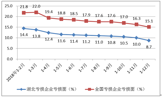 (一)企业亏损额有所扩大。2018年,全省规上企业中1359家出现亏损,亏损企业亏损额209.1亿元,增长4.9%,同比、环比分别扩大8、0.5个百分点。从所有制看,国有控股企业亏损额125.4亿元,增长15.2%,同比、环比分别扩大22.2、10.4个百分点;从企业类型看,小型企业亏损额78.6亿元,增长27.3%,同比扩大28.9个百分点;从市州看,武汉、黄石、十堰、襄阳、荆州亏损企业亏损额分别增长57.1%、31.9%、76.5%、85.5%、49.6%。