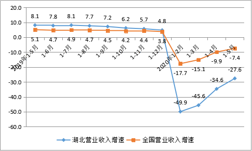 图1 全国和湖北各月累计营业收入同比增速(%)