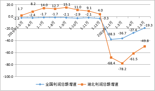 效益状况持续改善。1-5月,全省规模以上工业实现利润总额506.21亿元,同比下降49.8%,降幅分别比1-3月、1-4月收窄28.4、11.7个百分点。营业收入利润率4.2%,低于全国平均水平0.8个百分点,但分别高于1-3月、1-4月1.9、0.6个百分点,企业盈利水平有所提高。从不同所有制企业看,国有控股、私营控股、外商及港澳台控股企业利润同比分别下降71.6%、37.7%、53.7%,降幅比1-4月分别收窄7、11.5、18.1个百分点;从行业看,41个大类行业中40个行业利润增速比1-4月加快或降幅收窄(钢铁行业5月单月亏损2.19亿元,1-5月降幅较1-4月扩大10.6个百分点),其中烟草、化工、建材行业分别收窄31.9、25.8、13.9个百分点;从市州看,仙桃市1-5月同比增长31.7%,增幅环比1-4月加快25.2个百分点,其余16个市州全部收窄,其中十堰、黄冈、黄石3个市州分别收窄21.3、21.1、16.6个百分点,居前三位。
