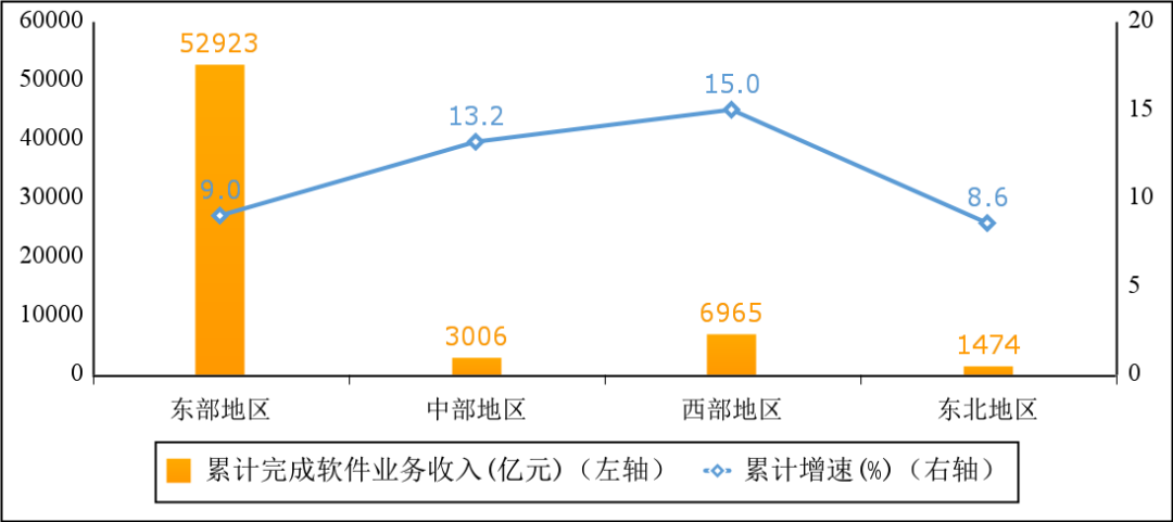 东部地区软件业务收入增长趋稳,西部地区增势领先。1-8月份,东部地区完成软件业务收入52923亿元,同比增长9.0%,增速较1-7月份回落0.5个百分点;中部地区完成软件业务收入3006亿元,同比增长13.2%,高出全行业整体增速3.4个百分点;西部地区完成软件业务收入6965亿元,同比增长15.0%,高出全行业整体增速5.2个百分点;东北地区完成软件业务收入1474亿元,同比增长8.6%,增速较1-7月份提高1.5个百分点。四个地区软件业务收入在全国总收入中的占比分别为82.2%、4.7%、10.8%和2.3%。