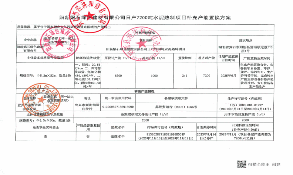 阳新娲石绿色建材有限公司日产7200吨水泥熟料生产线项目补充产能置换方案公告