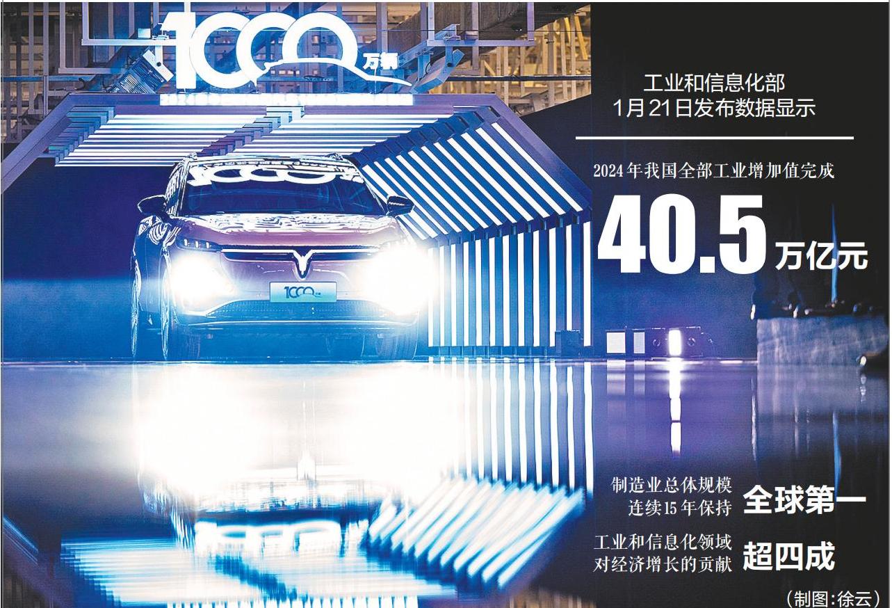 据新华社北京1月21日电 国新办21日举行的“中国经济高质量发展成效”系列新闻发布会上,2024年中国制造“成绩单”新鲜出炉:2024年,我国全部工业增加值完成40.5万亿元,制造业总体规模连续15年保持全球第一。