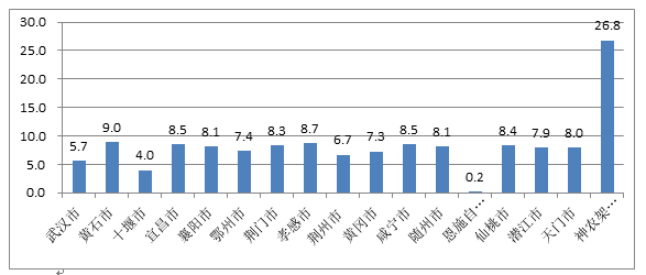 多数市州同比加快。2018年,17个市(州)中林区、宜昌、孝感、襄阳、随州、潜江、黄石、荆门、仙桃、咸宁、天门等11个同比加快,林区、黄石、孝感、咸宁、宜昌、仙桃、荆门、襄阳、随州、天门、潜江、鄂州、黄冈等13个市州高于全省平均水平。重点市州中武汉增长5.7%,同比放缓2个百分点;宜昌增长8.5%,同比加快8.6个百分点;襄阳增长8.1%,同比回落1.9个百分点。
