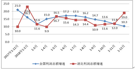 利润增速大幅回升。2018年,全省规模以上工业利润总额2755.4亿元,增长19%,同比、环比分别加快9、7个百分点,高于全国8.7个百分点(全国环比回落1.5个百分点),大幅高于全国。工业企业主营业务收入利润率为6.51%,同比、环比分别提高0.59、0.19个百分点,与全国持平。分行业看,41个大类工业中,33个行业利润保持增长,增长面为80.5%,24个行业增速高于全省平均水平,其中建材、钢铁、化工、农副食品加工行业增速分别为54.2%、47.9%、33.1%、28.4%。分市州看,17个市州中10个市州增幅超过10%,荆门、鄂州、宜昌利润增幅居全省前3位,分别增长66.6%、49%、39.4%。