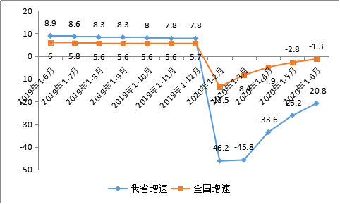 行业增长面趋增。6月当月,全省41个行业大类中有22个行业同比增长,较3月、4月、5月当月分别增加18个、5个和2个百分点,增长面升至53.7%。上半年,全省制造业增加值同比下降21.5%,较一季度收窄26.2个百分点。