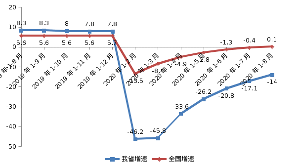 工业生产稳步回升。从工业增速看,8月当月全省规上工业增加值同比增长4.9%,环比加快2.7个百分点,月度增速接近全国平均水平。1-8月累计同比下降14%,环比收窄3.1个百分点,与全国差距从2月的32.7个百分点缩小至14.4个百分点。从行业增长面看,超过六成行业保持增长。8月当月,27个行业当月增加值实现增长(全国为29个),9个行业保持两位数增长,增长面为65.9%,连续两个月保持在50%以上。从市场主体看,8月当月,近六成企业止跌回升,其中大中型企业增加值增长5%,环比加快2.4个百分点。截至7月底,全省规模工业企业总量15549家,新增规上工业企业1131家。