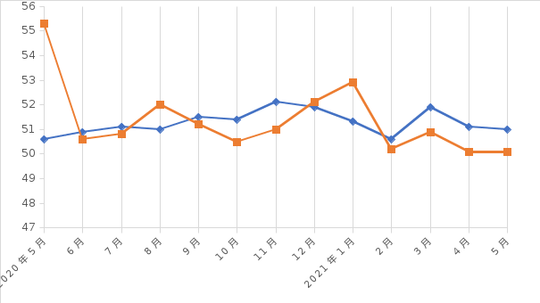 图3 全国和湖北各月制造业PMI指数(%)
