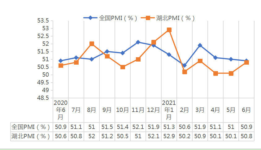 匹配指标进一步向好。6月份,湖北制造业采购经理指数(PMI)为50.8%,较上月上升0.7个百分点,制造业景气度稳中有升,连续15个月保持在扩张区间运行;1-6月,全省铁路货运量2453.3万吨,增长14.2%;其中6月单月432.2万吨,增长7.9%;1-6月,全省累计实现工业增值税441.4亿元,同比增长75.9%;1-6月,全省工业用电量累计增长30.4%,其中制造业用电量累计增长32.6%。