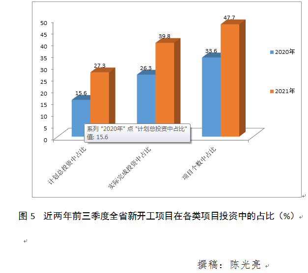 五是计划总投资增长稳定,新开工项目增长强劲。前三季度,从计划总投资看,工业计划总投资同比增长5.2%,其中新开工项目计划总投资同比增长83.6%,新开工项目占比为27.3%,占比同比提高11.7个百分点。从实际完成投资看,工业投资同比增长30.3%,其中新开工项目投资同比增长97.3%,新开工项目占比为39.8%,占比同比提高13.5个百分点。从项目个数看,施工项目9012个,其中新开工项目4295个,新开工项目占比为47.7%,占比同比提高14.1个百分点。