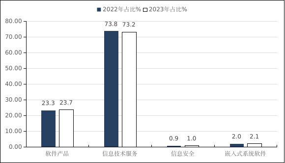 信息技术服务收入2249.24亿元,在全行业收入中占比为73.8%,同比增长20.1%;信息安全收入27.80亿元,同比增长14.6%;嵌入式系统软件收入62.29亿元,同比增长12.9%。