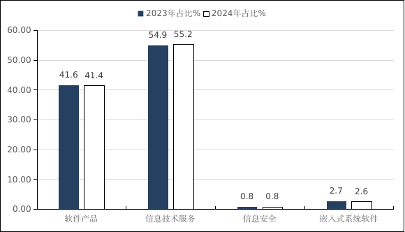 信息技术服务收入365.57亿元,同比增长12.8%,在全行业收入中占比为55.2%;信息安全收入5.41亿元,同比增长11.5%;嵌入式系统软件收入17.46亿元,同比增长9.3%。