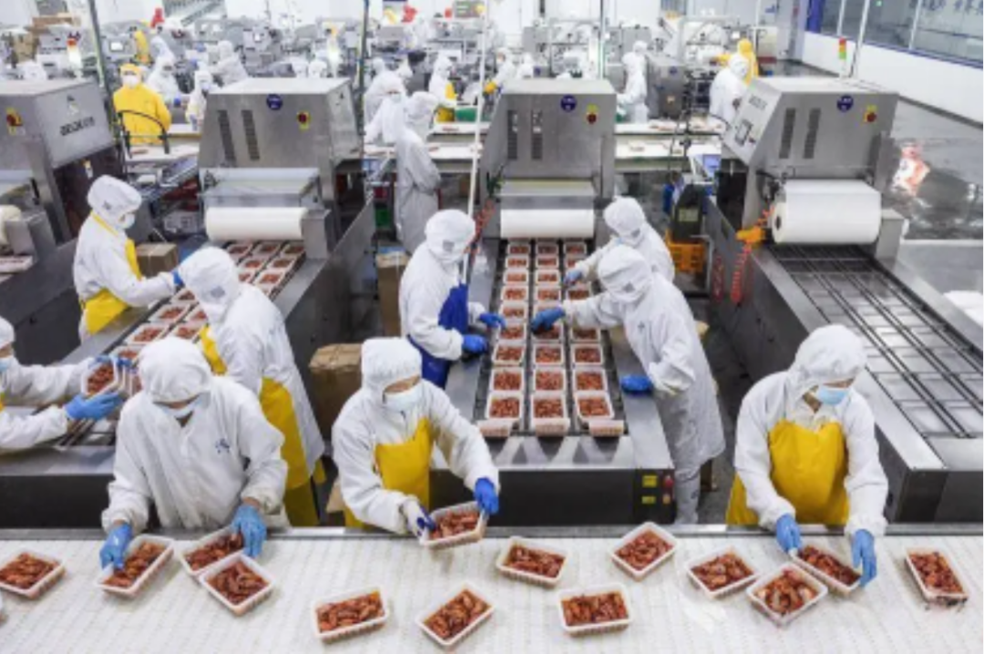 湖北小龙虾产业控股集团有限公司调味虾生产车间流水线上,小龙虾经过多道筛选、气泡清洗、蒸煮油炸、汤料灌装、速冻锁鲜、包装覆膜等程序制成成品,通过冷链物流网发往全国各地。