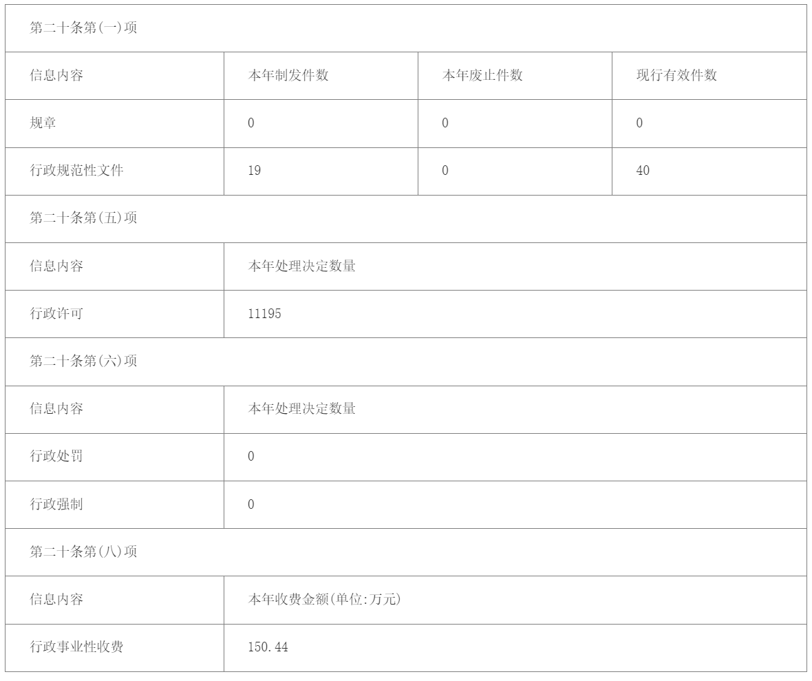 2023年,我厅共制发规范性文件19件;行政许可受理数量11195件,许可数量7252件;行政事业性收费150.44万元。