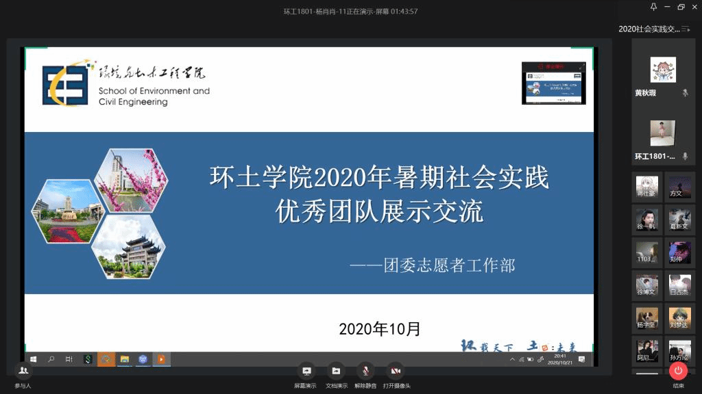 为帮助2020级新生了解并学习社会实践活动,环境与土木工程学院于2020年10月21日在线上开展了社会实践展示交流活动,环境与土木工程学院20级全体新生于线上参与学习。在辅导员何涛的组织下,由张磊、毛鹏涛、舒抒等同学为代表的优秀团队通过线上展示交流的形式与微密猫