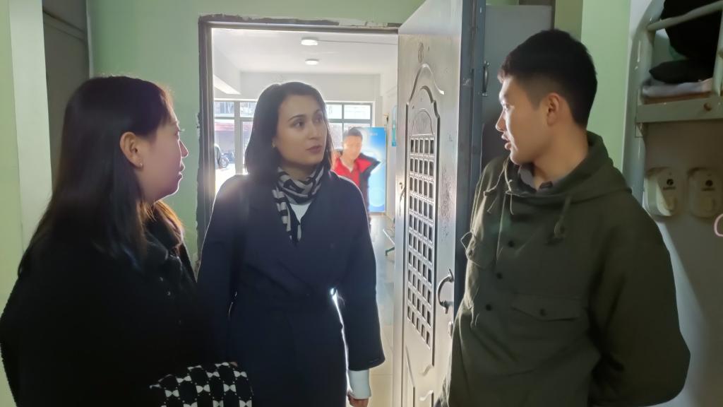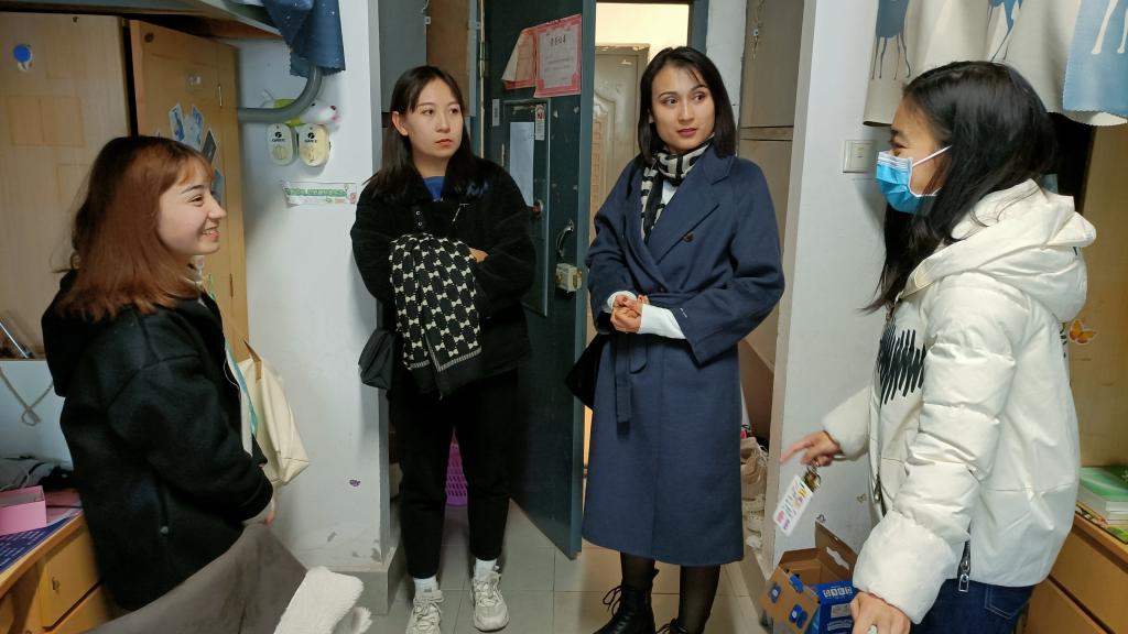 走访中,三位老师详细了解少数民族学生的学习生活情况和家庭情况,并鼓励他们坚定信心,自立自强,希望同学们合理安排学习生活,遇到困难及时向辅导员老师寻求帮助,争做民族团结模范标兵,学好科学文化知识,练强本领,认真准备期末考试,努力实现个人的全面发展。三位老师还细致查看了学生宿舍的环境卫生状况,提醒学生注意宿舍用水用电安全,严禁使用违规电器,提醒同学们要提高安全防患意识,多开窗户勤通风,做好个人卫生和疫情防护工作。仔细询问了少数民族学生的期末安排和返乡计划,提醒学生做好返乡途中的疫情防护,旅途中结伴前行。