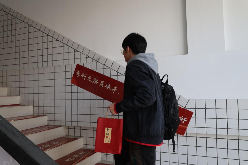 随后,学院为同学们准备了“上岸红毯”,在楼梯台阶上贴满了密密麻麻的考研祝福语,每一条都饱含学院师生的殷殷祝福;学院还为考研学生准备了精美的考研大礼包,礼包中准备了同学们所需的文具用品,以及一份“准录取通知书”,为同学们加油打气,还有一些寓意深刻的慰问品,如橙子寓意胸有“橙”竹、心想事“橙”,状元糖寓意金榜题名、状元及第等。这些礼物不仅体现了学院对考研学生的深情厚谊,更传递了学院对他们的殷切期望和美好祝福。