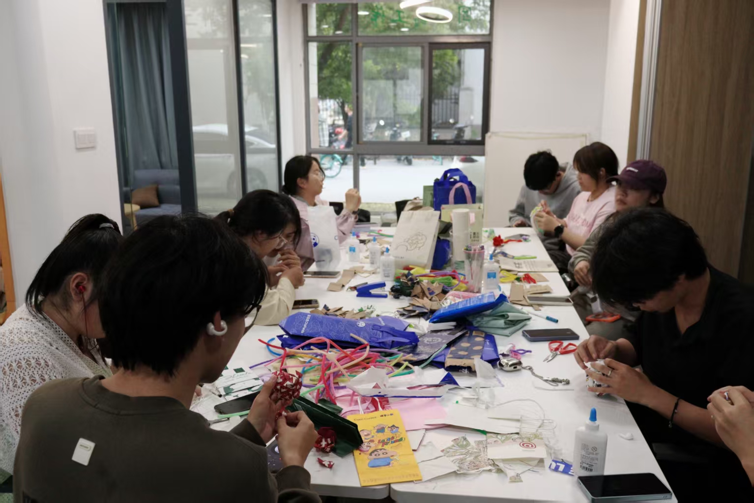 活动现场,参与者以纸杯、牛皮纸袋、扭扭棒、草稿纸等日常废弃物为原料,展开了别开生面的“变废为宝”创作。大家充分发挥创新思维,将一次性纸杯剪裁装饰为春日小花盆,把废旧牛皮纸袋改造为枫叶造型书签,用彩色扭扭棒编织出绿植茎叶,普通草稿纸经折叠拼贴化作精致绣球。在两个小时的实践过程中,青年学子相互交流制作技艺、分享环保心得,一件件兼具实用性与艺术性的手工艺品相继诞生,既展现了“化腐朽为神奇”的创意巧思,也成为“资源循环利用”理念的生动注脚,现场洋溢着劳动创造的热情与绿色生活的共识。