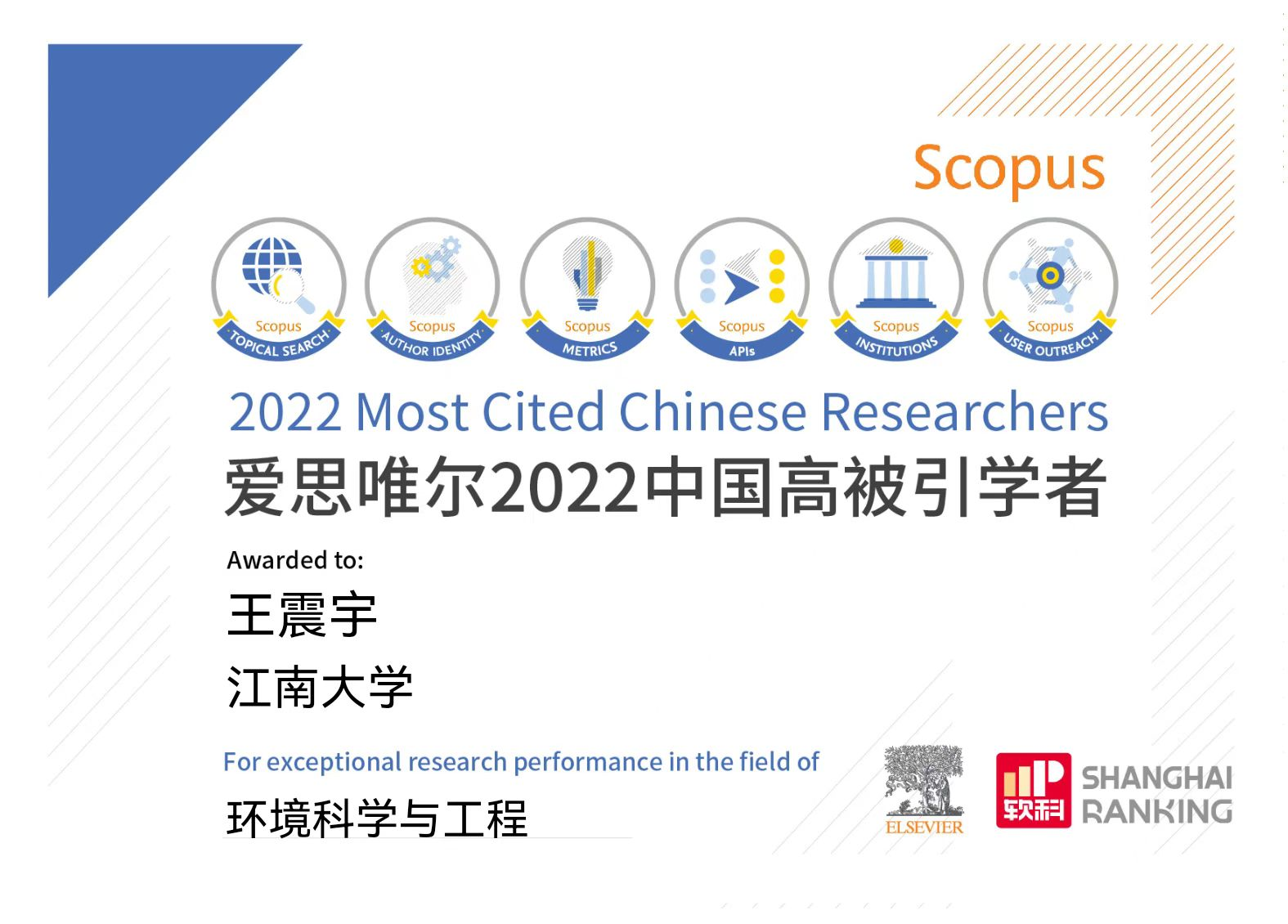 爱思唯尔“中国高被引学者”荣誉证书