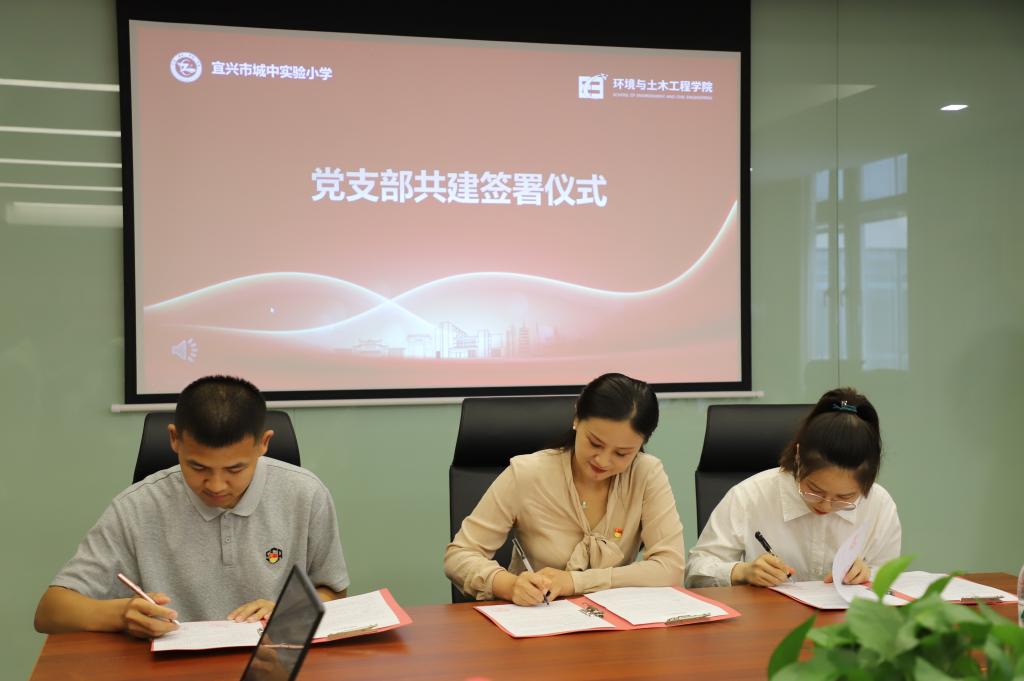 宜兴城中实验小学党支部书记马进、环境与土木工程学院教工环境二支部书记郁红艳、东氿校区研究生第一、第二党支部书记万骋宇、毛雪莲共同签署了党支部共建合作协议,希望通过整合资源,充分发挥各自优势,资源共享,以优质党建推进微密猫