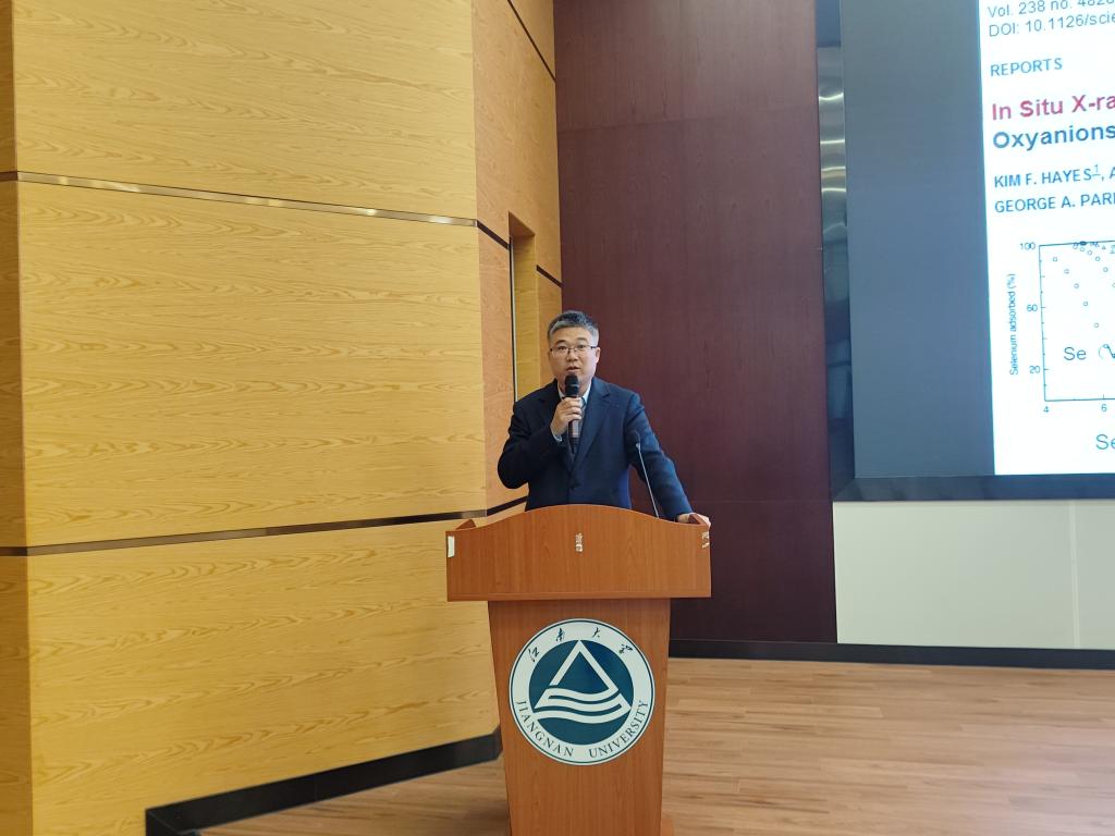 曹心德是上海交通大学环境科学与工程学院党委书记,土壤地下水污染修复技术研究所所长。上海市“浦江人才”计划获得者,全球高被引用科学家,国际SCI期刊Chemosphere副主编。长期致力于土壤地下水污染修复技术、土壤地下水环境多界面转化过程、土壤生物炭固碳技术等方面的研究。曹教授以“基于生物炭有序无序碳结构转化的环境功能效应”为题,向在场师生讲解了生物质在热解过程中的有序无序碳结构转化规律,以及不同结构有序性的生物炭对重金属铬和砷固定和有机污染物的催化氧化的作用效果和机制。最后,结合崇明岛示范基地的实际工程介绍了生物炭在土壤封存固碳方面的应用。
