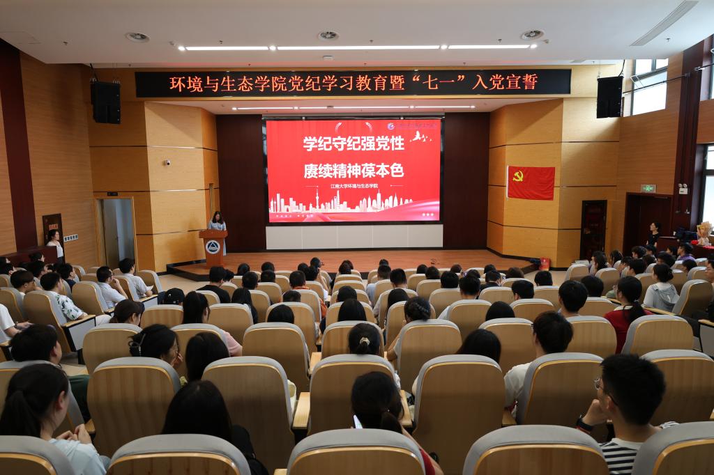 党委在东氿校区清源楼(钱盘生楼)101报告厅举办“学纪守纪强党性,赓续精神葆本色”党纪学习教育暨“七一”入党宣誓活动。学院全体师生党员参加此次活动,活动由院党委副书记胡娟主持。