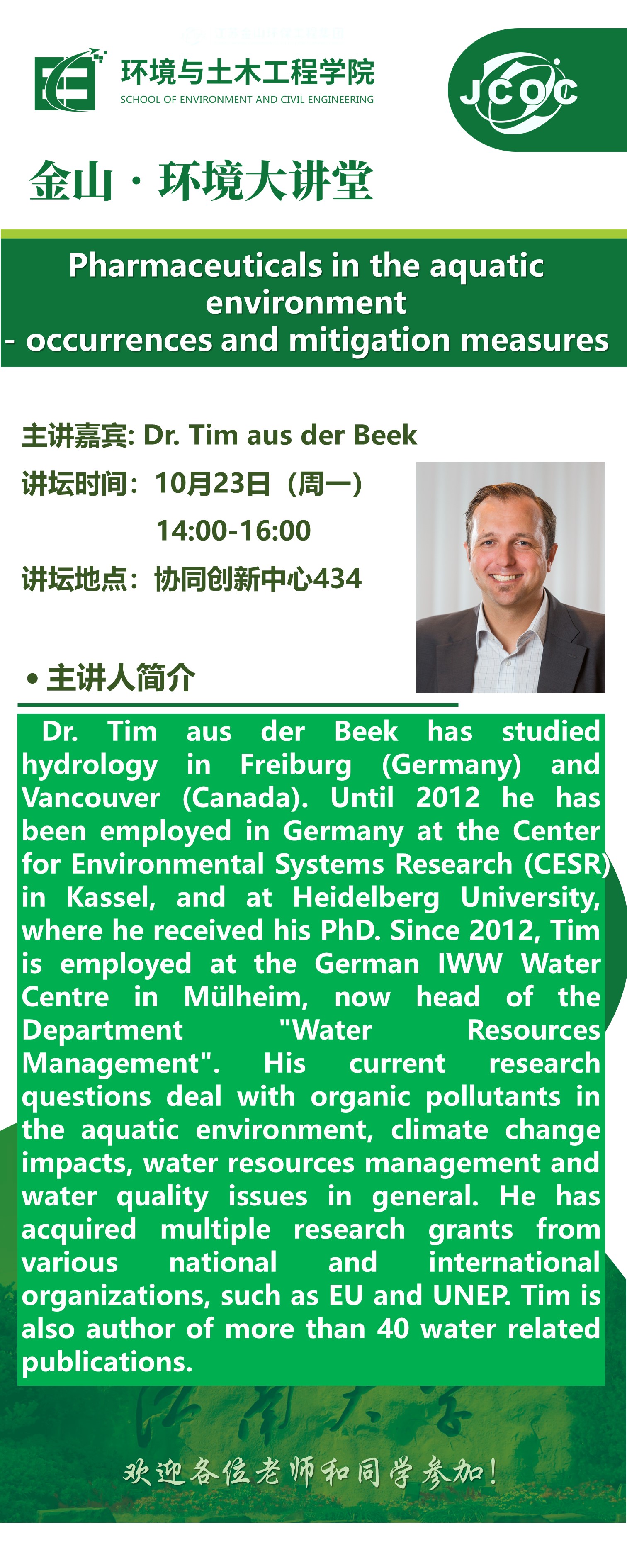 微密猫大讲堂 --Dr. Tim aus der Beek:Pharmaceuticals in the aquatic environment occurrences and mitigation measures