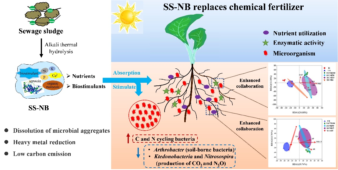 近日,李激教授团队在著名学术期刊Advanced Science上发表了题为“Double Advantages of Nutrients and Biostimulants Derived from Sewage Sludge by Alkaline Thermal Hydrolysis Process for Agricultural Use: Quality Promotion of Soil and Crop”的论文。文中以污泥碱式热水解技术生产促进植物生长的营养物质和激励素,探讨了污泥基营养激励素(SS-NB)的功能特性和土壤生化效应。研究结果表明SS-NB在减少温室气体排放和预防土壤病害方面具有积极作用,可通过刺激土壤微生物进一步增强与土壤酶活性和土壤养分利用率的协作,在农业生产具有良好的应用前景。