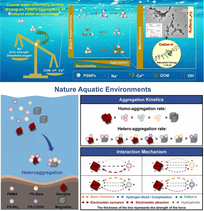二)基于密度泛函理论和2D-COS,明确了复合环境因素介导下纳米塑料的自相团聚和异相团聚机制。溶解性有机碳(DOC)、pH和Ca2+是影响蠡湖水中聚苯乙烯纳米塑料(PSNPs)自相团聚的主要水化学因素(p<0.05);PSNPs的临界团聚浓度(CCC)随水体pH的增加而增加;阳离子增加了腐殖酸(HA)在PSNPs上的吸附,HA的共存使PSNPs在NaCl溶液中的CCC增加了2.6倍,但在CaCl2中的CCC降低了1.8倍,对纳米塑料的悬浮稳定性具有交互作用。通过表征结合密度泛函理论计算,揭示了HA-阳离子复合物(HA-Ca2+和HA-Na+的EAE = ‒1.10 eV和‒0.51 eV)而不是单独的HA(EAE = ‒0.33 eV)是水环境中PSNPs表面吸附的主要场景,且在该场景下,PSNPs和HA-阳离子复合物之间的阳离子-π机制主导着PSNPs的团聚和沉降。纳米塑料在天然水环境中发生自相团聚,而与共存矿物(如铁矿物)发生异相团聚更加主导其团聚沉降,进一步改变其环境归趋和生态风险。团队以四种纳米塑料(PMMA、PS-Bare、PS-NH2、PS-COOH)和两种铁矿物(赤铁矿和磁铁矿)为研究对象,率先通过批次异相团聚实验和界面表征结果明确了纳米塑料与铁矿物之间的异相团聚和相关的界面作用机制与纳米塑料和铁矿物的类型有关。纳米塑料的同相团聚会影响其与铁矿物随后的异相团聚,此外,PMMA和PS-COOH的引入会打破铁矿物的同相团聚。氢键、络合作用、疏水作用、阳离子-π作用和静电作用参与了纳米塑料与赤铁矿之间的界面反应,电子从纳米塑料转移到赤铁矿,导致Fe3+还原为Fe2+。