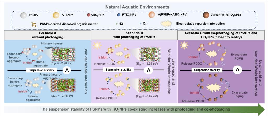 纳米塑料和不同种类纳米二氧化钛的共光老化对其异相团聚的影响机制