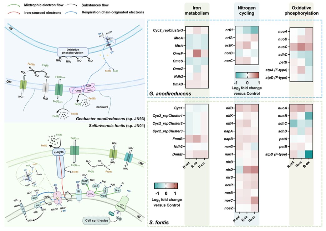 磁铁矿作为导电材料因其生物相容性和易于合成而在生物系统中受到青睐,同时在增强直接电子转移和充当电子穿梭体方面特别有效,从而可以促进种间电子传递过程。由于脱氮过程是由多种微生物之间协调完成,磁铁矿的引入可能会引起微生物群落结构和代谢相互作用的改变。鉴于此,深入研究优势物种的氮代谢潜力以及不同表型反硝化菌之间种间关系的改变将具有非常重要的意义。分别经过氧化和还原处理的磁铁矿的研究探讨了不同铁价态的主要贡献,并基于以基因组为中心的宏基因组分析,阐明了磁铁矿对优势物种的选择性以及Geobacter sp.的代谢活性的影响。