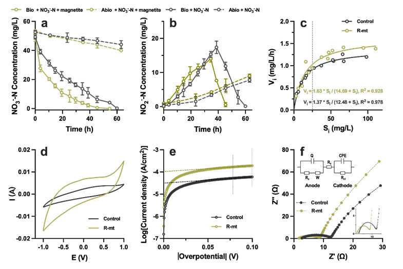 Fig. 1. Concentration changes of nitrate (a) and nitrite (b), fitted Michaelis-Menten equation (c). CV curves (d), Tafel plots (e), and Nyquist diagrams from EIS (f) in Control and R-mt groups.