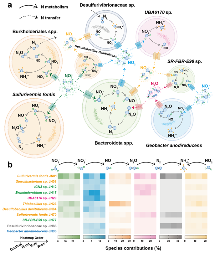 Fig. 6. Potential interactions among the top seven most abundant species in each group (a) and their contributions to different nitrogen metabolic processes (b).