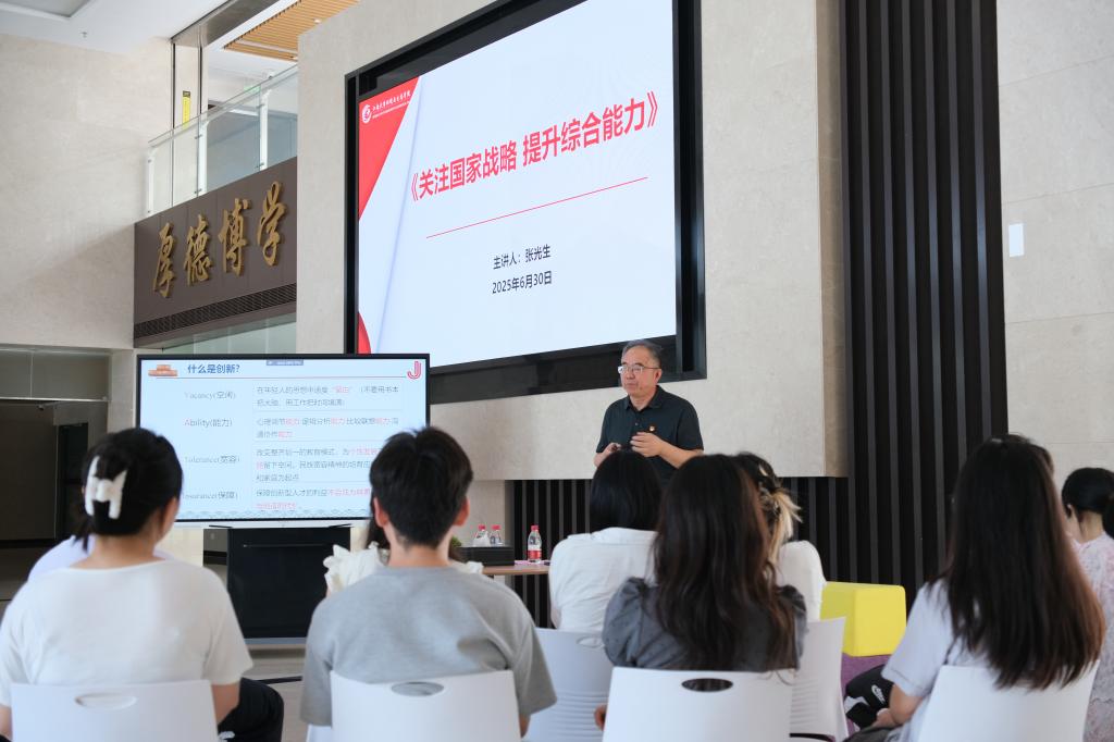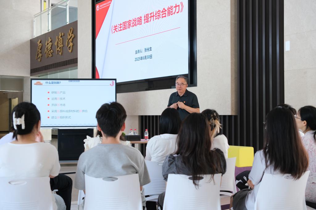 关工委常务副主任、宜兴食品与生物技术研究院院长张光生作《关注国家战略,提升综合能力》主题讲座,并同步举行2025年暑期社会实践出征仪式。学院师生代表、暑期实践团成员共同参与活动,为即将奔赴各地的实践团队注入思想动力与行动指引。